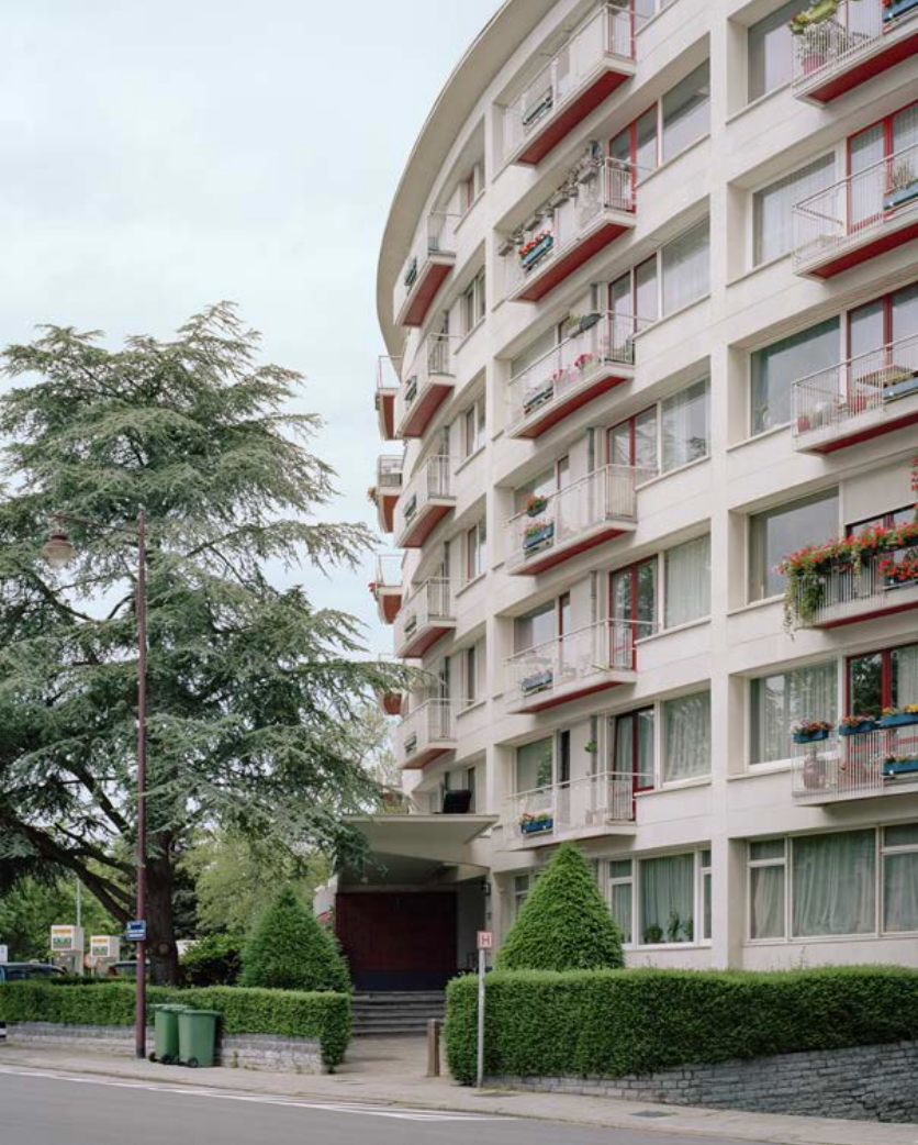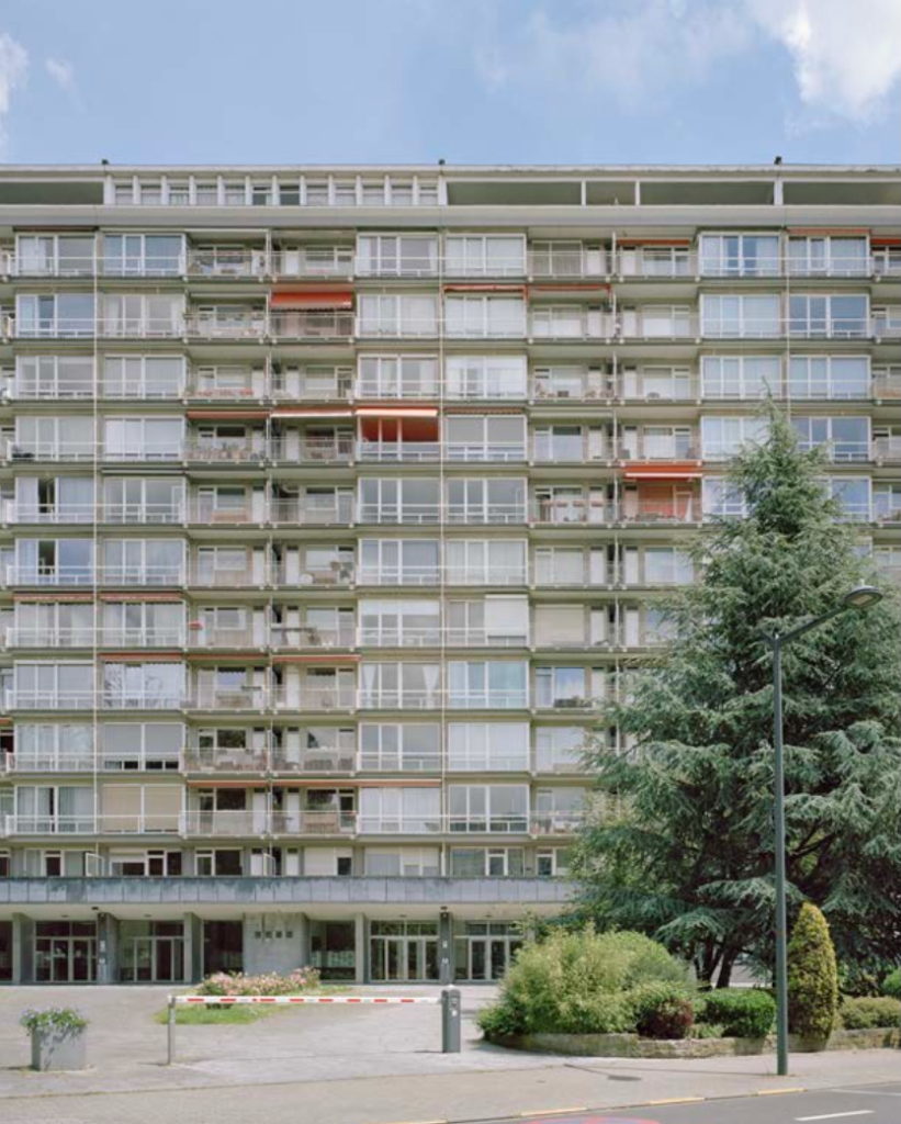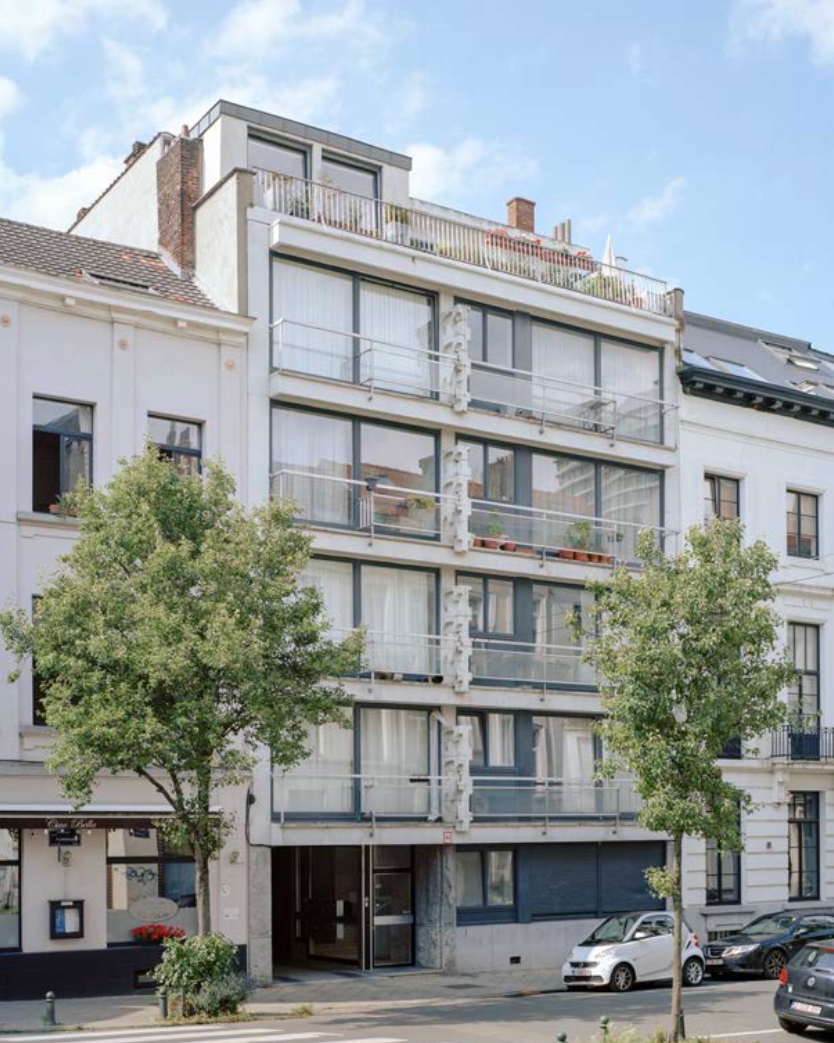 Parmi ses réalisations les plus emblématiques figure un immeuble résidentiel des années 1950, situé face à l’hippodrome du Bois de la Cambre. Composé de deux volumes parallèles posés sur pilotis, cet édifice moderniste est isolé dans le paysage, ce qui lui confère une monumentalité étonnante. Toutes les unités sont traversantes, dotées de terrasses, et bénéficient d’importantes qualités de lumière et de confort — des principes fondamentaux dans l’approche de Franssen.