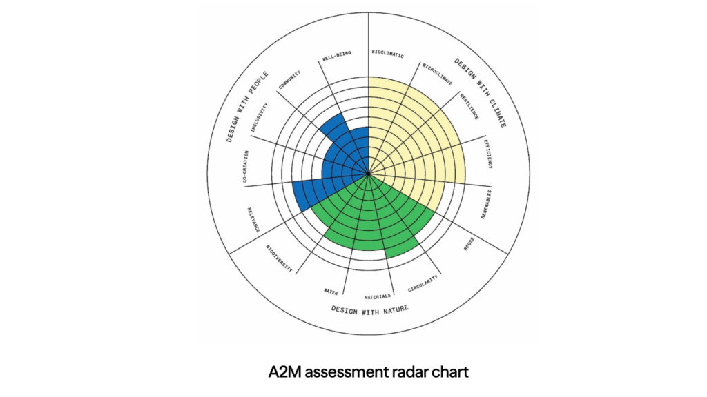 A2M place la physique du bâtiment au cœur du projet : conception passive, enveloppes performantes, anticipation des scénarios climatiques futurs, coopération énergétique territoriale. Concevoir en tenant compte du climat signifie également intégrer les phénomènes climatiques et leurs fluctuations environnantes comme des outils essentiels du processus de conception. Cela prend également en compte le carbone opérationnel et renouvelable.