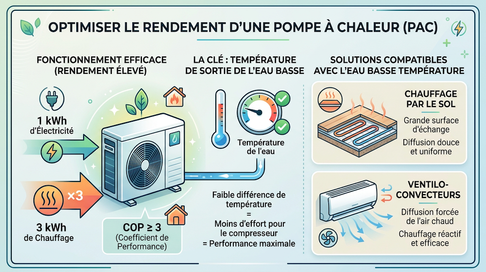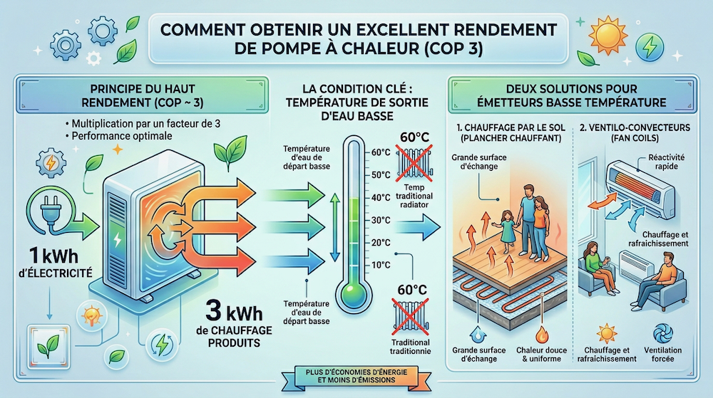 En effet, plus la température de chauffage est basse, plus le rendement est élevé. Cela implique une conception globale cohérente entre architecture et technique.