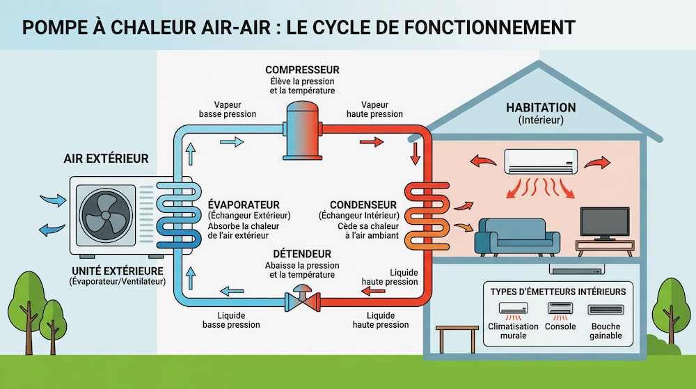 Le système air-air, souvent associé à la climatisation, fonctionne sans circuit d’eau. Il diffuse directement de l’air chaud ou froid dans les pièces.